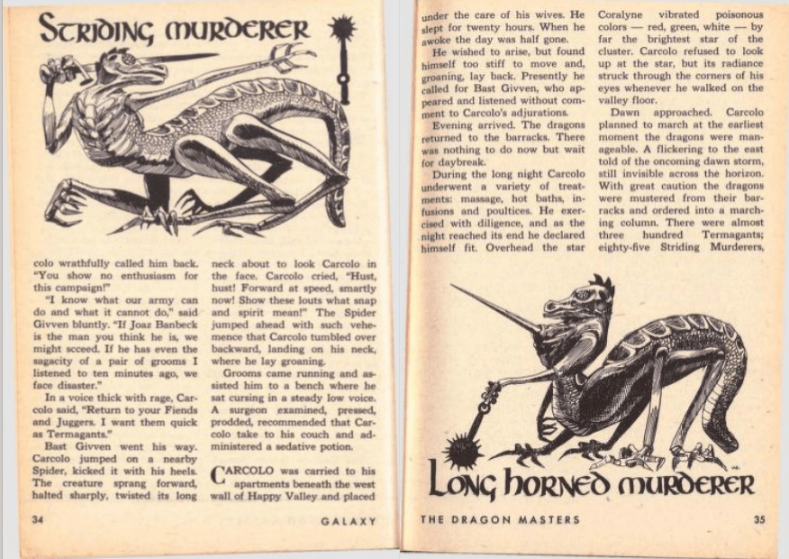 While Ervis is functionally the villain of the story (at least for most of it), and is by all accounts a bastard, he’s not totally without redeeming qualities. Joaz has a friend in Phade, so similarly Ervis has a shoulder to lean on in the form of Bast Givven, his right-hand man and one of the titular dragon-masters (it has a hyphen in-story but not in the title, how strange). Bast is the Horatio to Ervis’s Hamlet, in that he doesn’t seem to exist outside of Ervis’s role in the story, but he also functions as the straight man to Ervis’s theatrical antics. Happy Valley would pose more of a threat to Bandeck Vale, except it’s not as well-armed and, frankly, it suffers from subpar leadership. It also doesn’t help that by the time Ervis realizes the Basics really are invading, it’s too late to make amends with Joaz. Fighting the Basics would’ve been easier, and presumably the story would’ve been a bit shorter, if the human forces were able to unite for longer than literally a day. It’s a good that these characters are a step above cardboard, because we do need something to anchor us while so much shit happens in the span of almost ninety magazine pages. (That number is rather deceptive, though, since I would say at least a dozen pages are dedicated to Gaughan’s interiors.) Vance could’ve reasonable expanded this into a full novel, given how many variations of dragon and human slave there are (so many that Vance barely has time to describe them all), but the plot itself is worth novella-length. By modern standards especially this would come as compressed almost to the point of fitting on the head of a pin, but then it doesn’t overstay its welcome.