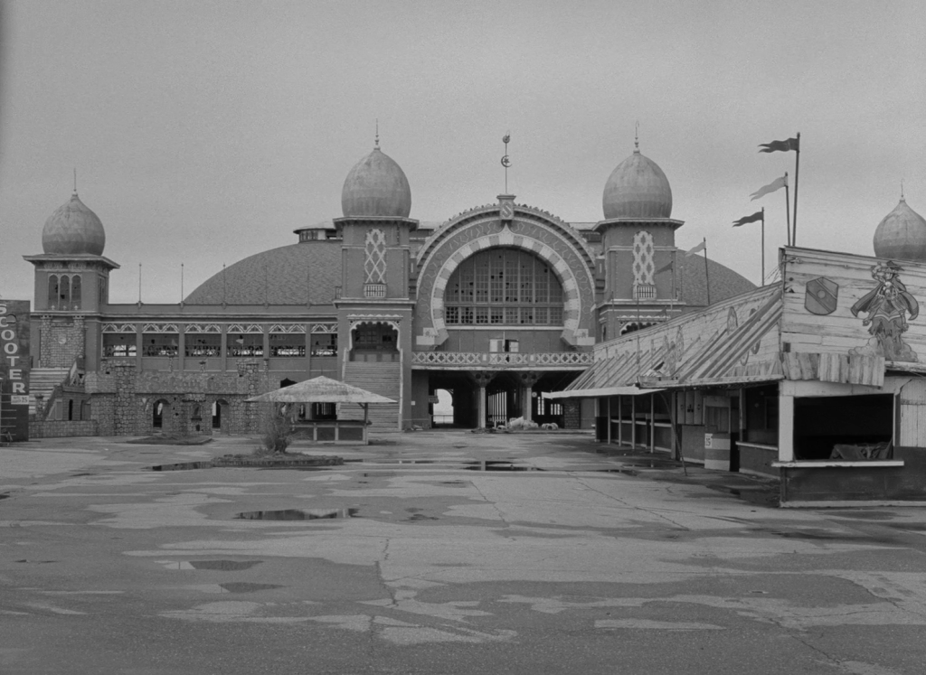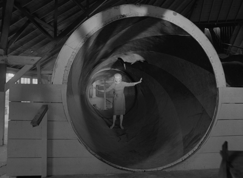 If taken literally, Carnival of Souls is a spooky story about a woman who thinks she has cheated death, but if you try even slightly you’ll find that this is a resonant and prescient study of a woman suffering from some undiagnosed mental illness, trying to live in a world dominated by “normal” people. It is at the very least explicitly about a woman who, following her accident, lives in a permanent state of disconnect from the rest of humanity, a kind of switch being flipped in her brain which she may or may not be able to flip back the other way. It’s ambiguous if Mary’s unusual mental state is something she had before the accident or if it’s brought on from trauma, but regardless she acts as if being around people for longer than short controlled bursts is a burden on her—to other people’s dismay. As the minister says during their first meeting, “But my dear, you cannot live in isolation from the human race, you know.” At first Mary is content to live on her own, with her crummy job and not having any friends, but eventually the loneliness does get to her; but at the same time she has some unwanted company, with John from the side of the living and the pale man from that of the dead. She quite literally phases in and out of reality at a few points in the movie, where people can’t see or hear her and she fully becomes a ghost. She’s stuck in a liminal position, between wanting but being unable to socialize with the living while also being scared of the ghosts she sees dancing at the carnival at night. During the daytime the carnival just a normal industrial area, totally empty of human life; but while there’s no ghost who can torment her here during the day, it’s eerily missing that human touch. It shouldn’t come as a surprise that the sequence at the halfway point of the movie, where Mary explores Saltair II, might be my favorite.